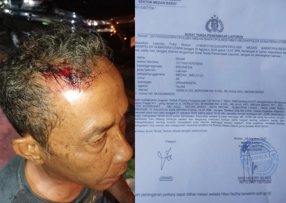 AtensiRakyat.com : Medan – Seorang warga bernama Ishar (58) warga Jalan Gereja Gang Bersama, Kelurahan Sei Agul, Kecamatan Medan Barat, menjadi korban pengeroyokan hingga mengalami luka serius. Dalam kondisi bersimbah darah, ia mendatangi Polsek Medan Barat, Rabu (27/8/2025) untuk melaporkan peristiwa tersebut.